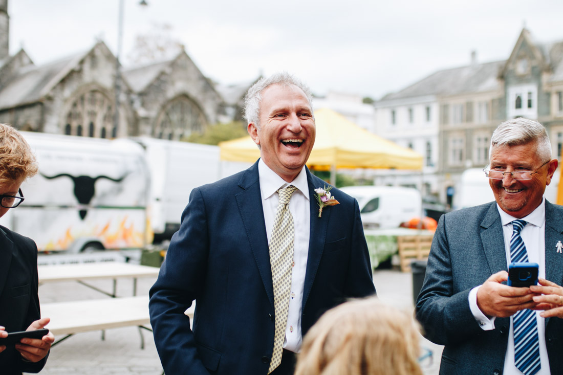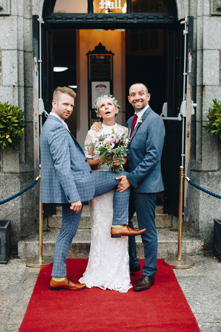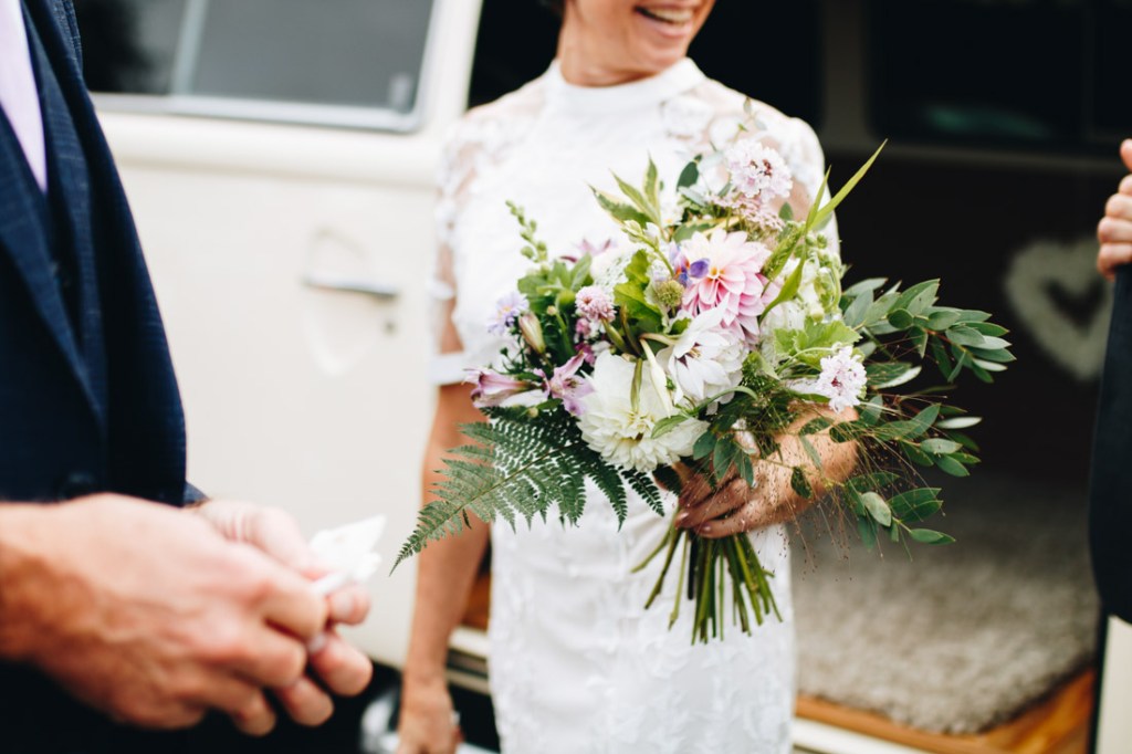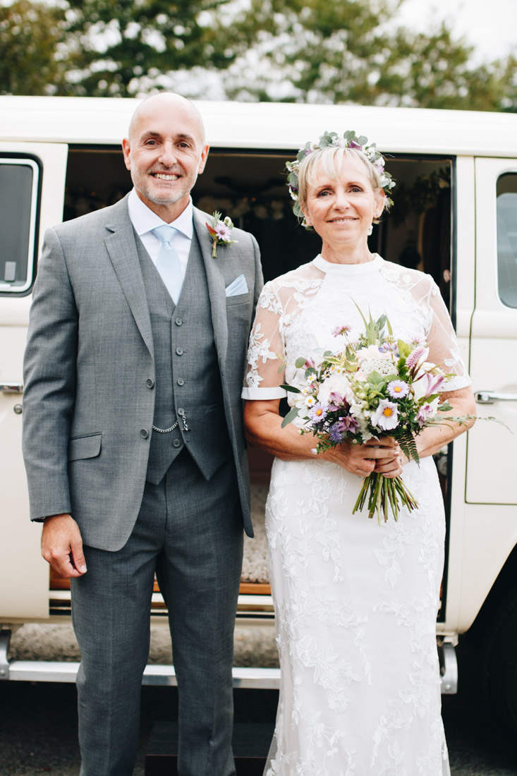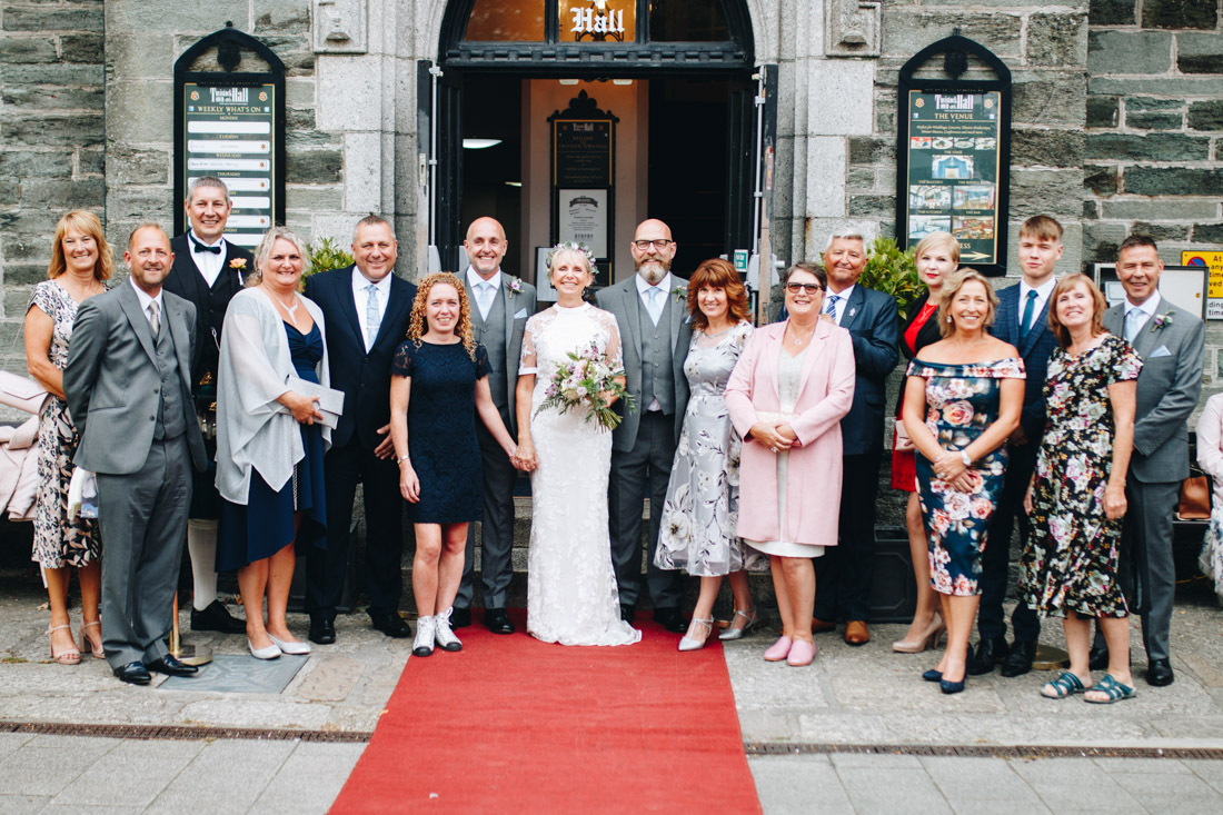 Now for the even windier walk down to the bottom of the hill. It was truly going for it now, so I made the executive decision to have the group photos done at the reception venue, the town hall. Rachel & Gary had a snazzy ride in a VW Campervan with Your Wedding Wheels, which had a fluffy rug and champagne!